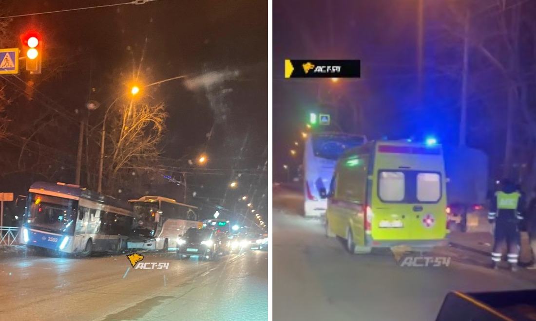Фото с места происшествия очевидцы поделились в телеграм-канале «АСТ-54 black». По их словам, водитель автобуса въехал в троллейбус.