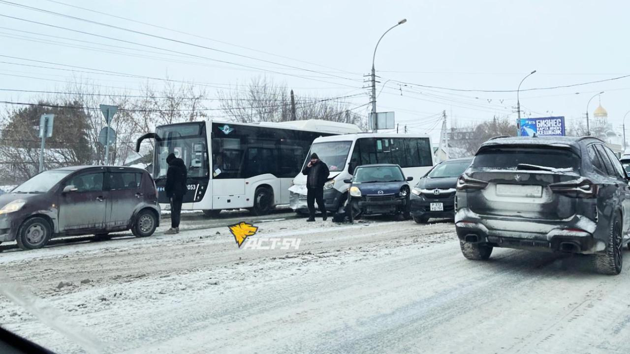 На улице Ватутина рядом с торговым центром «Мега» столкнулись пять автомобилей, включая два маршрутных такси, пишет телеграм-канал АСТ-54 Black.