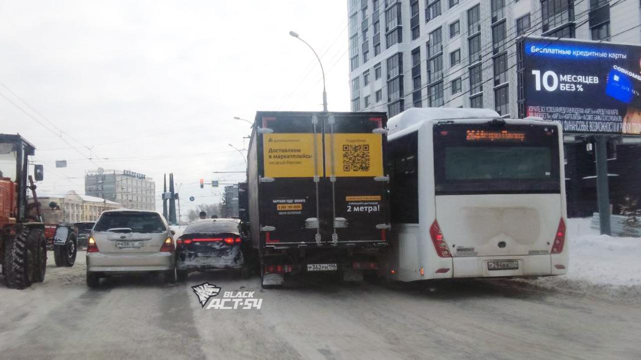 Днём 13 января перед площадью Сибиряков-Гвардейцев произошло ДТП с участием минивэна Honda Odyssey, седана Kia Rio, ГАЗели и автобуса №264.