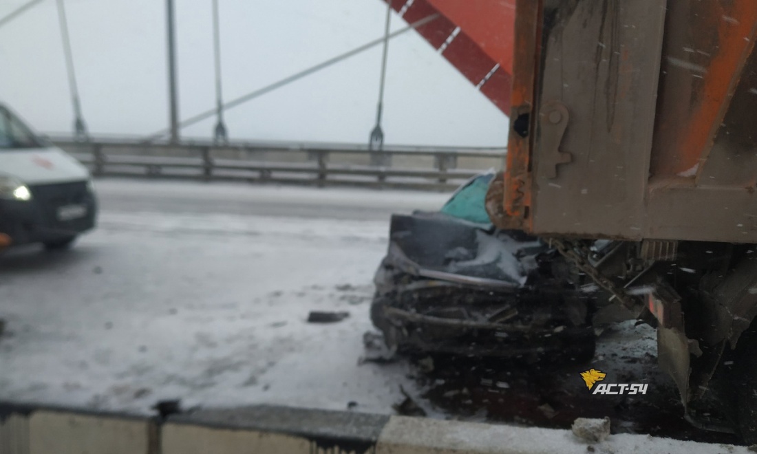 ДТП произошло утром в пятницу, 15 марта. В крайнем правом ряду на Бугринском мосту стояли самосвалы для вывоза снега. Водитель иномарки не справился с управлением и влетел под стоящий самосвал.