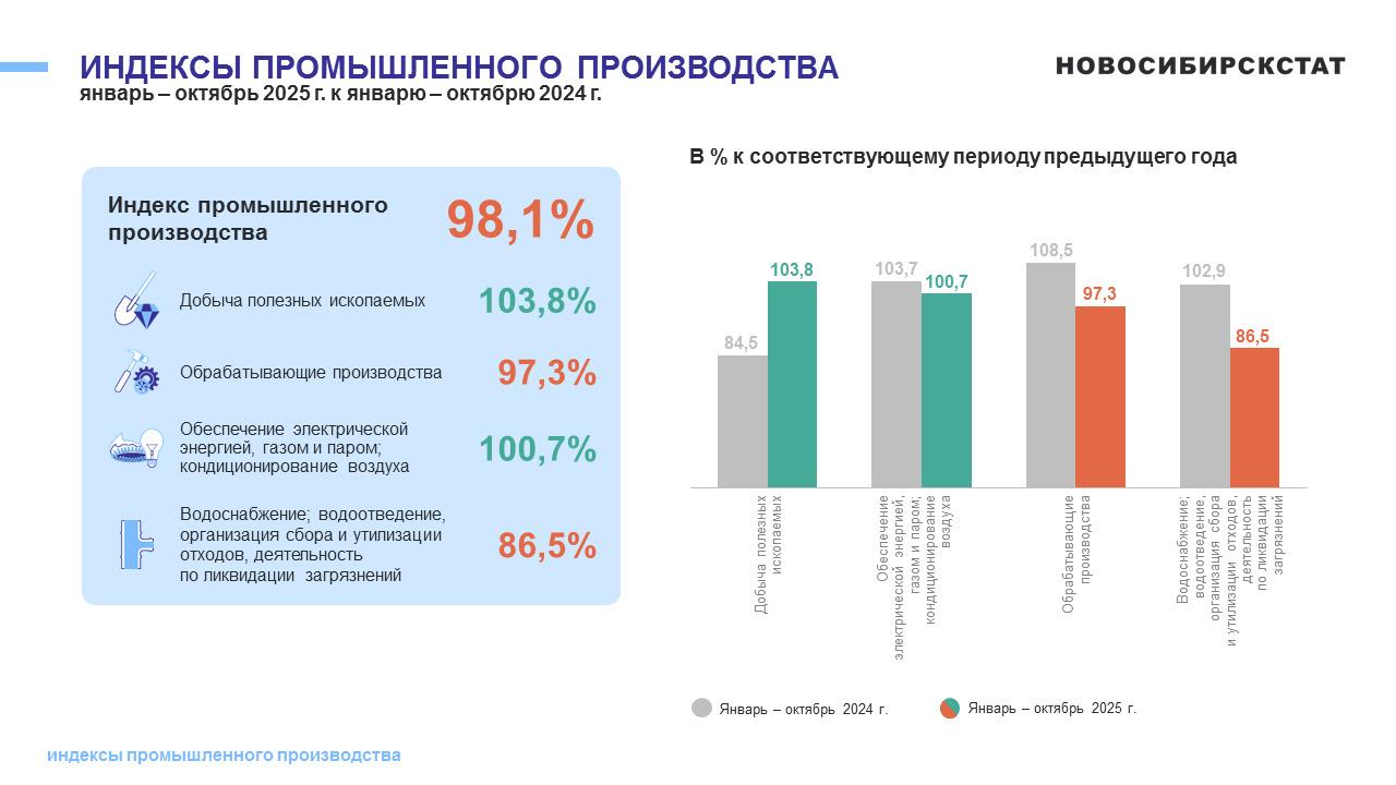 В Новосибирской области индекс промышленного производства за период с января по октябрь 2025 года составил 98,1% по сравнению с аналогичным периодом 2024 года.
