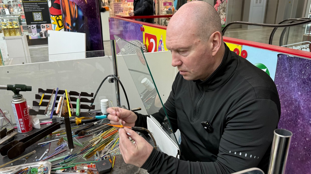 С тех пор жизнь Алексея неразрывно связана со стеклом. Только раньше он изготавливал вазы, графины и бокалы в больших печах. Сейчас, после переезда в Новосибирск, у него своя маленькая мастерская. Там не установишь крупное оборудование, но есть столик с горелкой. За этим небольшим «островком» в торговом центре мужчина вместе с посетителями создает из расплавленного стекла необычные серьги или мультяшные фигурки.