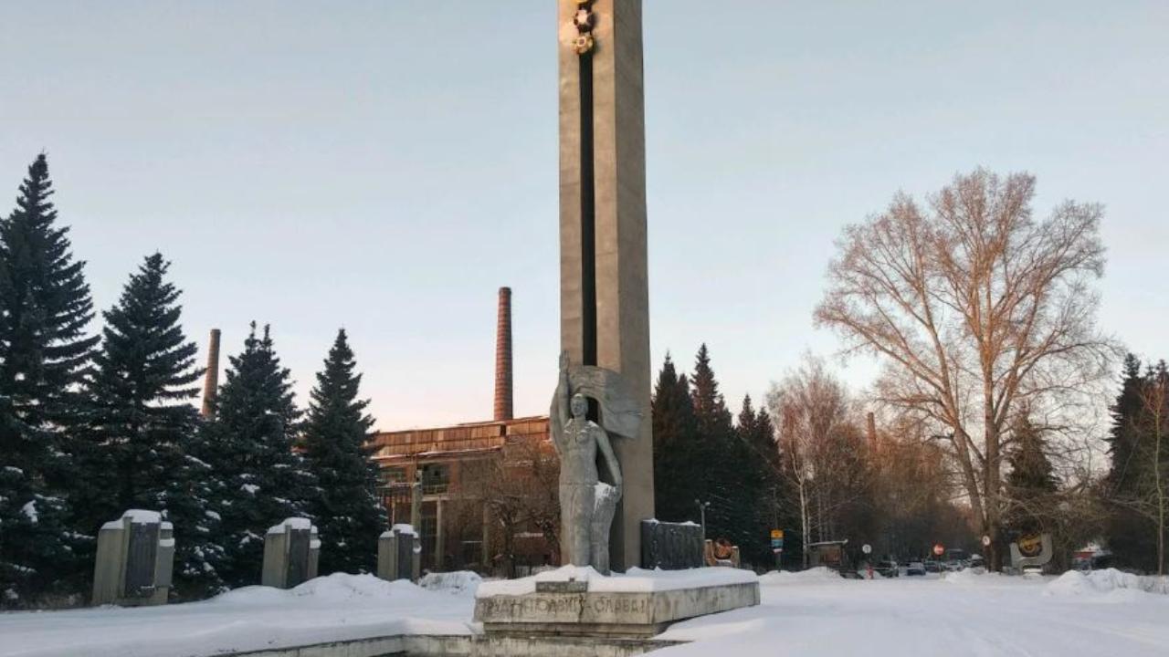 Монумент трудовой и боевой славы завода «Сибсельмаш» состоит из бассейна, скульптуры женщины в полный рост и других конструкций. На постаменте с южной стороны размещена надпись: «Труду и подвигу слава».