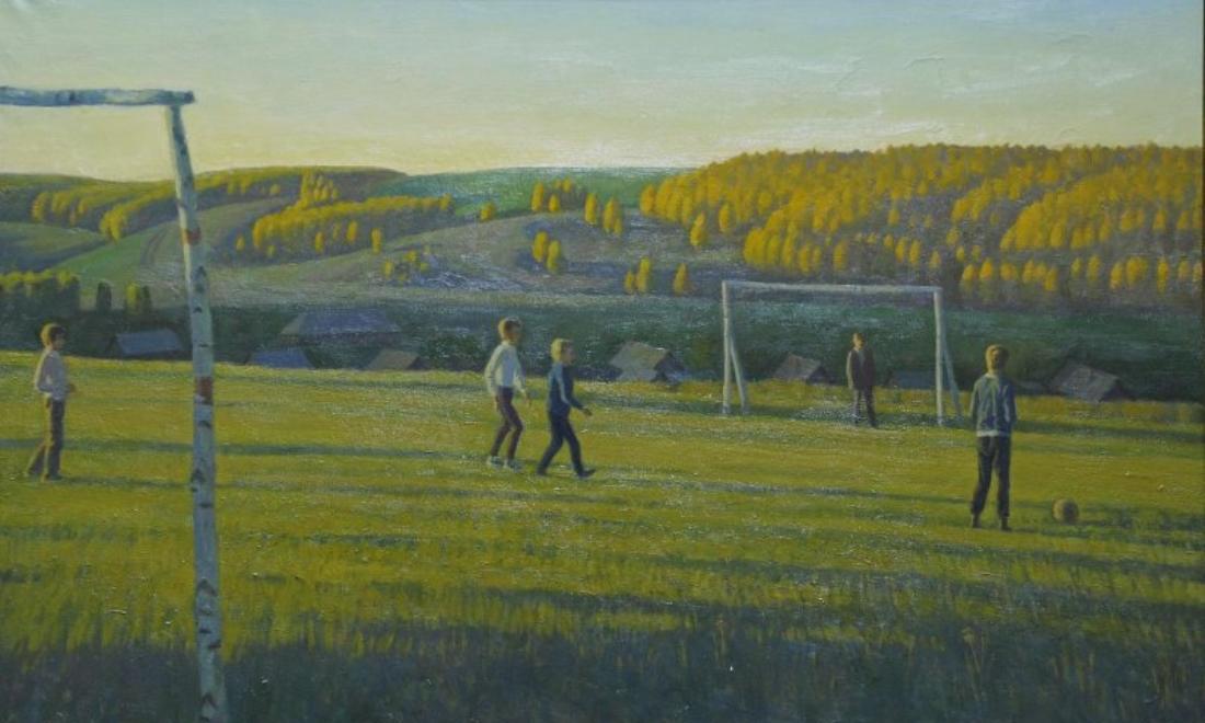 На картине изображен холмистый пейзаж. На первом плане ребята играют в футбол. На втором – холмы, поросшие жёлтыми деревьями. Начало сентября — это прекрасная возможность для ребят в последние дни перед школой провести время за летними забавами, именно это своей работой хотел показать Александр Анатольевич.