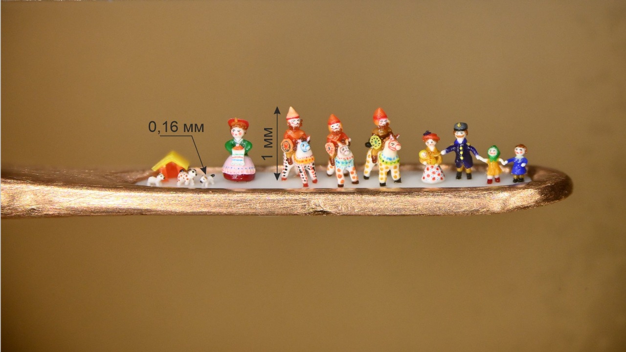 Эта необычная работа будет представлена на выставке «Уникальная Россия» в Москве. Высота игрушек, которые микроминиатюрист поместил в ушко золотой иглы, — от 0,16 мм (собачка) до 1 мм (богатырь на коне).