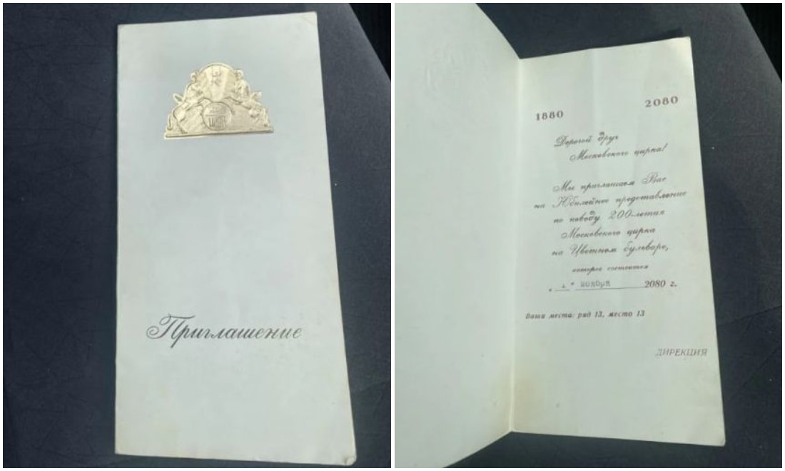 «Дорогой друг Московского цирка! Мы приглашаем Вас на Юбилейное представление по поводу 200-летия Московского цирка на Цветном бульваре, которое состоится 1 ноября 2080 года».
