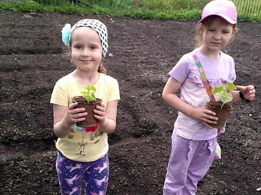 Дошколята принесли семена овощей и посеяли их на занятиях. Затем наблюдали за процессом роста, а в мае с воспитателями высадили растения на своих участках, расположенных рядом с детским садом. Появились грядки с морковью, свеклой, капустой, горохом, тыквой, кабачками, в теплице заняли свои места огурцы, помидоры, болгарский перец. Родители детей помогли педагогическому коллективу посадить картофель.