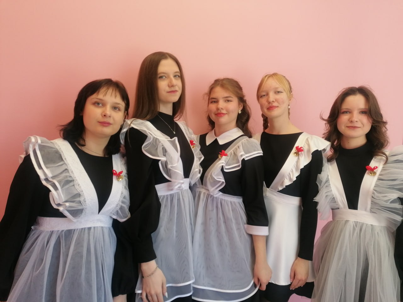Девочки были в нарядах, напоминающих советскую форму – чёрное платье и белый фартук. Правда, вместо классических туфель – кроссовки.