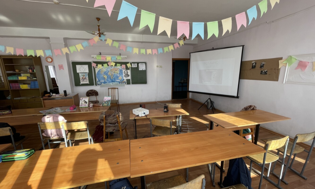 Нужно обновить обои, парты, стулья, линолеум, и создать техническое оснащение: экран, колонка, проектор.