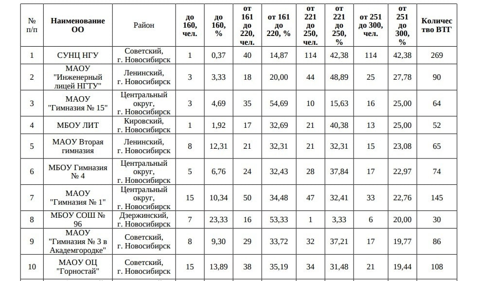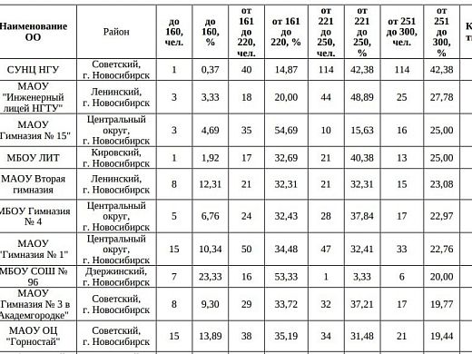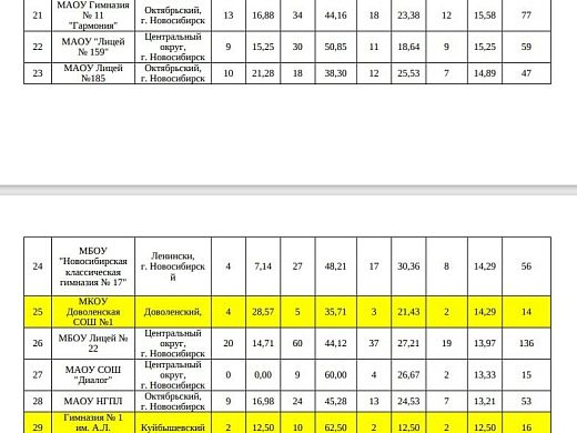 На первом месте СУНЦ НГУ, на втором МАОУ «Инженерный лицей НГТУ», на третьем МАОУ «Гимназия № 15». Сравнивая с прошлым годом, элитная гимназия № 1 попала на седьмое место. Ранее учреждение занимало второе место. Лицей № 130 вышел из десятки лидеров. Однако в этом году поднялись гимназия № 3 и образовательный центр «Горностай». В списке поднялась гимназии № 15 – с 15 места до третьего. Доля выпускников, показавших плохой результат, менее 160 баллов, в 15 гимназии значительно выше (4,69%), чем у школ, расположившихся ниже в рейтинге.