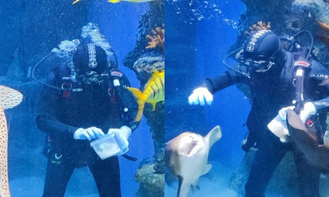Водолаз нырнул в аквариум, чтобы угостить водных обитателей. Акулы не только полакомились блинами, но и разрешили себя погладить.