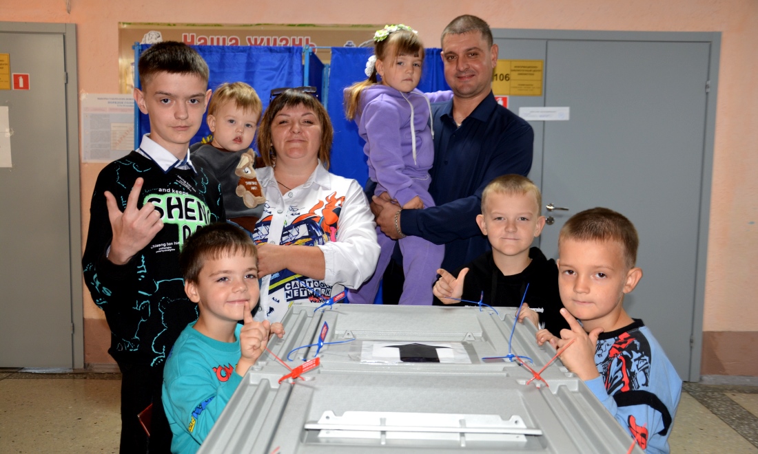 Виталий и Екатерина Хазовы из Карасукского района Новосибирской области показали пример своим детям и всей семьёй приехали на избирательный участок. Старший из семи детей голосовал впервые.