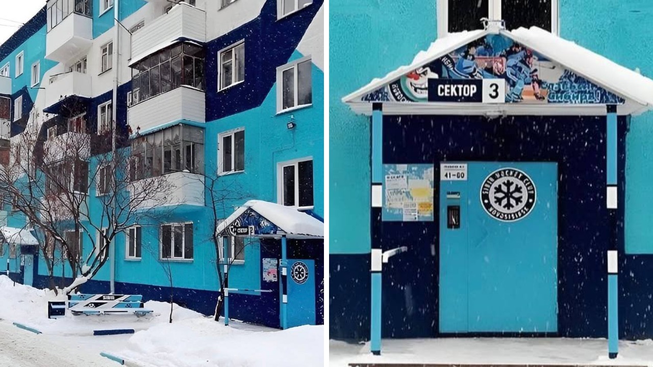 Фасад здания выкрасили в цвета клуба, а на торце появилась фигура хоккеиста и эмблема команды. Подъезды теперь обозначены как «секторы», а скамейки и таблички украшены хоккейной символикой.