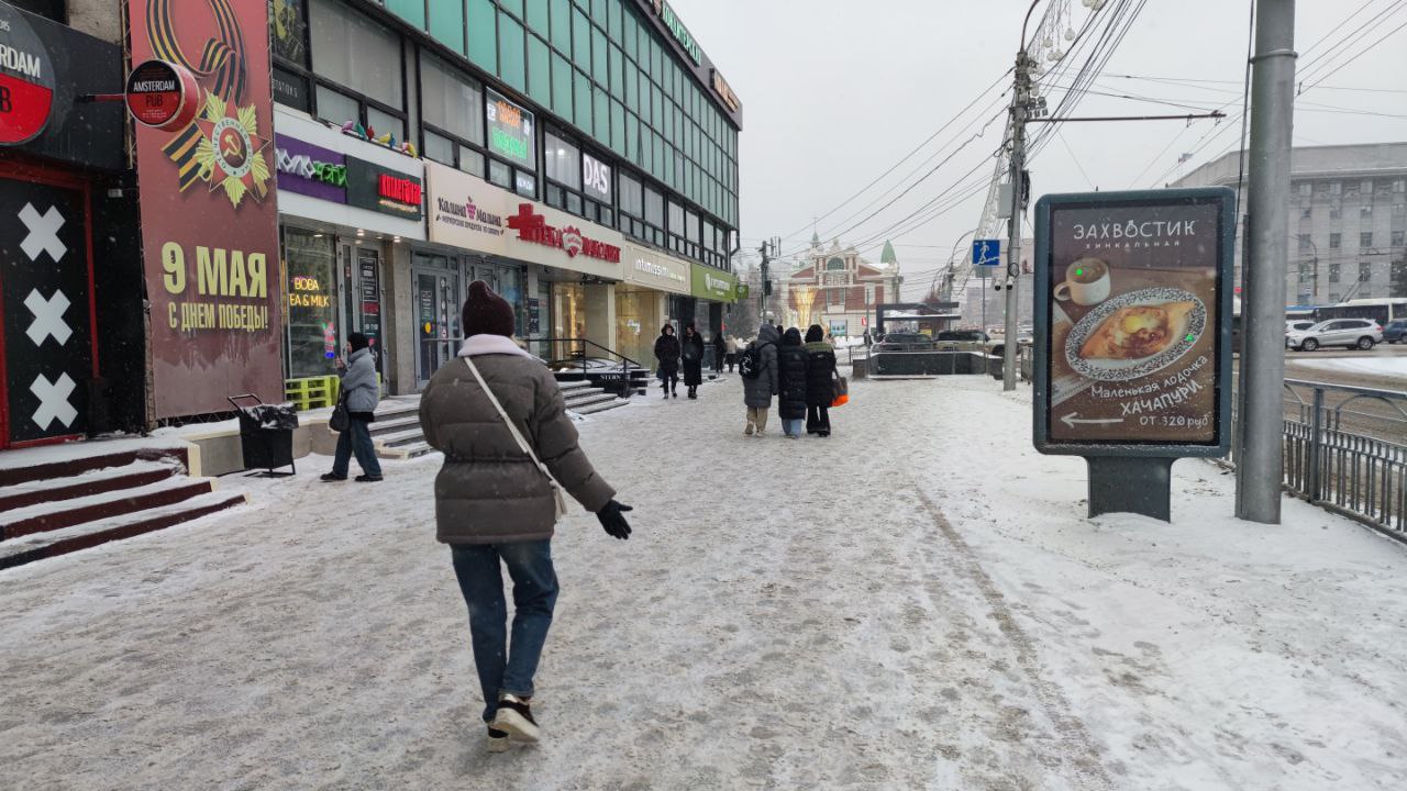 К моменту, когда журналист вернулась на левый берег, тротуар на проспекте Карла Маркса посыпали реагентами, и лёд растаял.