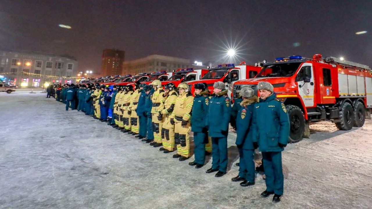 Торжественное построение пожарно-спасательных и аварийно-спасательных подразделений прошло утром 27 декабря на площади Ленина.
