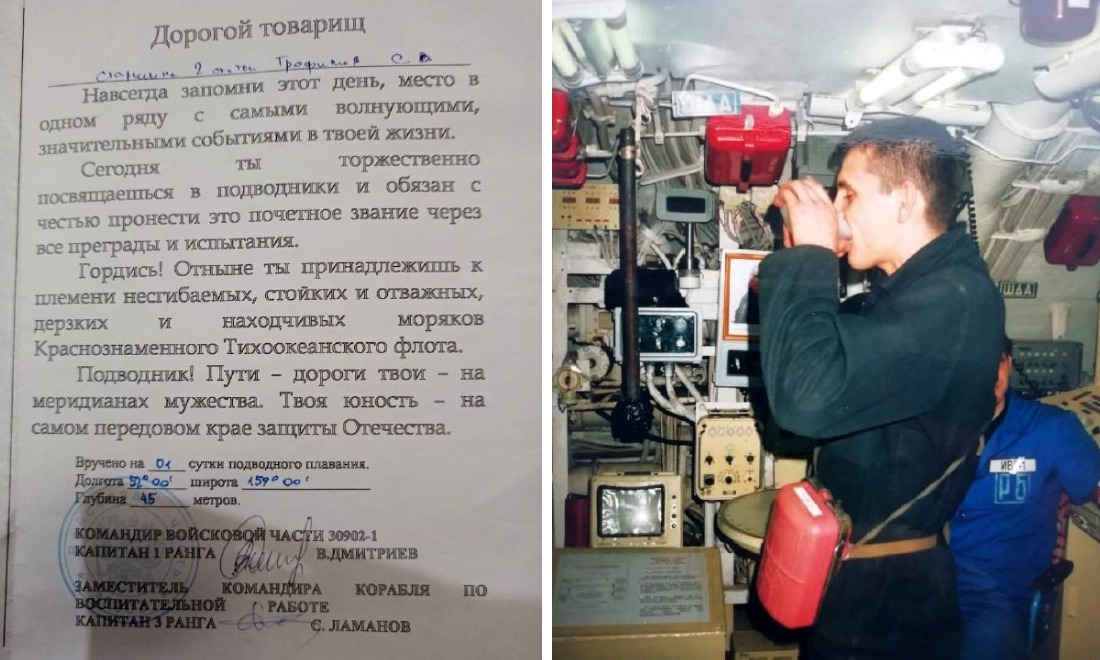 «Нужно было выпить плафон солёной воды и поцеловать кувалду в мазуте. При первом погружении, на глубине 100 метров и под кораблем 200, нас пригласили на центральный пост. Построили. Выдали плафон морской воды, в нём около литра. Выпил – и целуешь кувалду в солидоле. Сразу предоставили сушёную воблу и свидетельство о посвящении в подводники. Тогда нас было человек двадцать новичков», – вспомнил события 2002 года Сергей Трофимов.