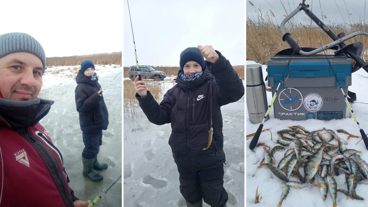 «Практически каждый год ездим сюда. Этот участок замерзает в первую очередь: из-за того, что речка узкая – буквально метров шесть-восемь – нет течения, а от ветра защищает камыш. Сын сам попросился: «Пап, а поедем на рыбалку?» Отправились сначала в одно место – там ничего интересного, и потом уже приехали сюда. Лёд от четырёх до девяти сантиметров – вполне ходовой, нормальный», – объяснил рыбак.