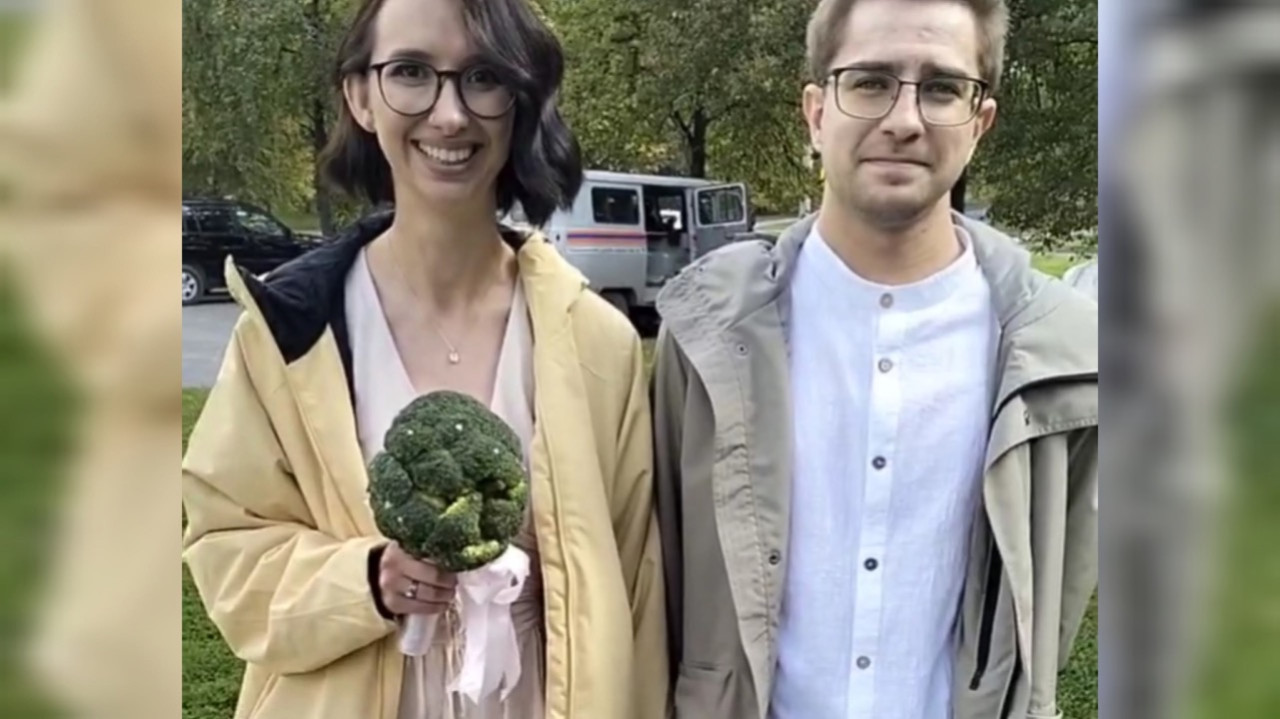 Новосибирцы запечатлели пару, где видно, что невеста держит в руках букет из брокколи, украшенный стразами.