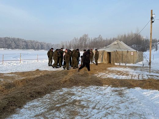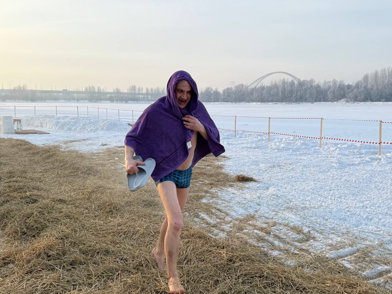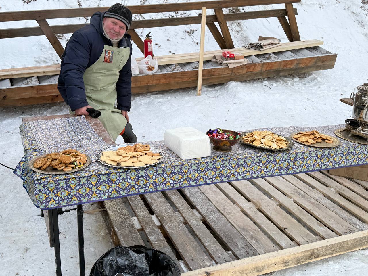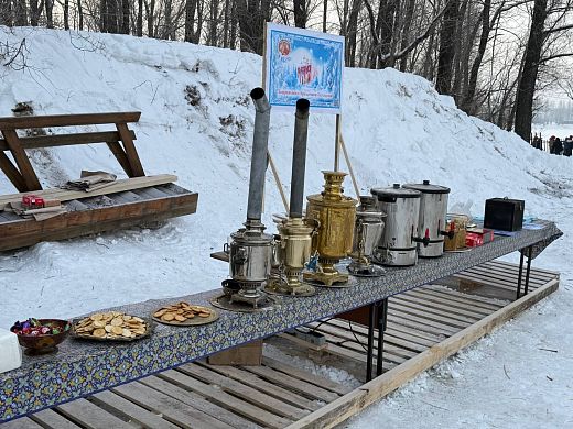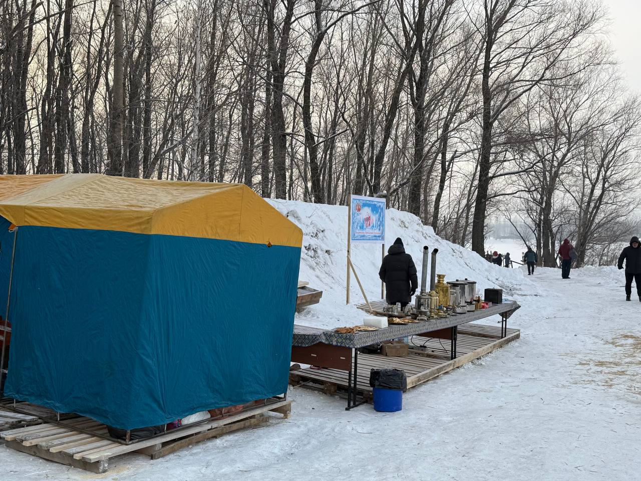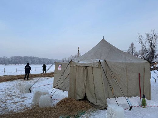 Чтобы никто не замёрз, возле воды оборудовали тёплые палатки. Там же новосибирцев угощают чаем и печеньем. Дорожки, ведущие до мест обогрева, специально посыпали сеном для предотвращения скольжения.