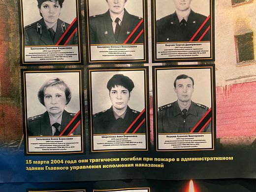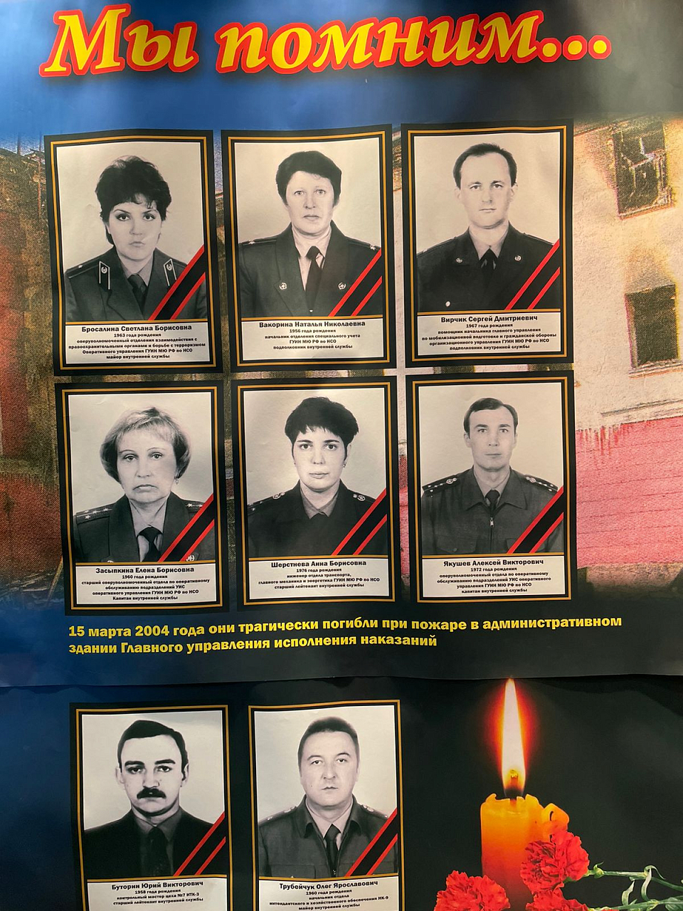 Сразу шесть сотрудников погибли во время пожара в административном здании ГУИН по Новосибирской области. Это начальник отделения специального учета, подполковник внутренней службы Наталья Вакорина; помощник начальника Главного управления по мобилизационной подготовке и гражданской обороне организационного управления, подполковник внутренней службы Сергей Вирчик; старший оперуполномоченный отдела по оперативному обслуживанию подразделений УИС оперативного управления, капитан внутренней службы Елена Засыпкина; инженер отдела транспорта, главного механика и энергетика, старший лейтенант внутренней службы Анна Шестернёва; оперуполномоченный отдела по оперативному обслуживанию подразделений УИС оперативного управления, капитан внутренней службы Алексей Якушев; оперуполномоченный отделения взаимодействия с правоохранительными органами и борьбе с терроризмом оперативного управления, майор внутренней службы Светлана Бросалина.