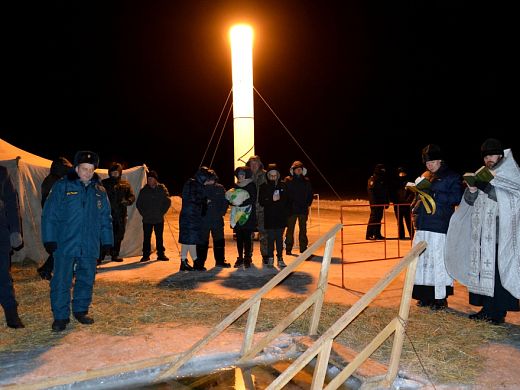 Для совершения православной традиции на озере Красном под Карасуком оборудовали купель. Возле неё установили железнодорожный световой столб, палатку с тепловой пушкой, развернули специализированный пункт обогрева, который оснащён всем необходимым для оказания помощи: здесь же можно было согреться и выпить горячего чая. Саму прорубь оборудовали деревянной конструкцией с лесенками по двум сторонам, вокруг просыпали сеном.
