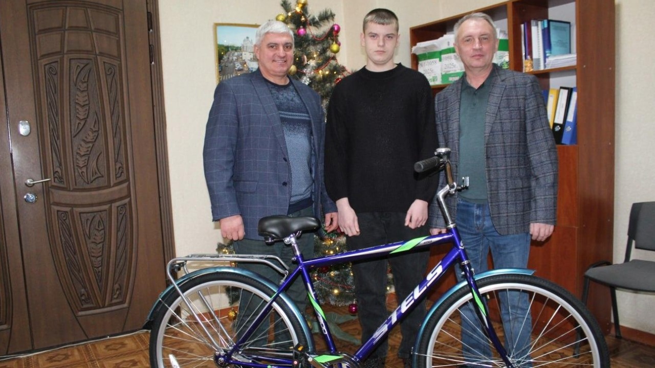 Велосипед в подарок от главы региона школьнику вручили руководитель местной администрации Виталий Коваленко и представитель Новосибирской области Сергей Донодаев.