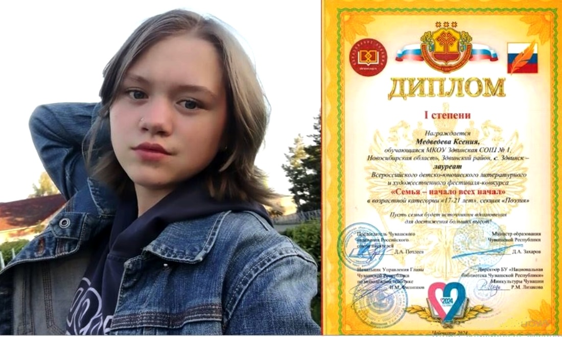 Фамилия Ксении Медведевой из Здвинского района Новосибирской области оказалась в списках победителей IX Всероссийского детско-юношеского литературного и художественного фестиваля-конкурса «Семья – начало всех начал». Его провели среди обучающихся и педагогов общеобразовательных организаций, профессиональных и высших учебных заведений. Стихотворение юной поэтессы из села Здвинск признано лучшим в её возрастной номинации. Итоги подвели в конце прошлого года, а в январе пригласили победителей в Чувашию, где в Национальной библиотеке республики прошла торжественная церемония награждения.