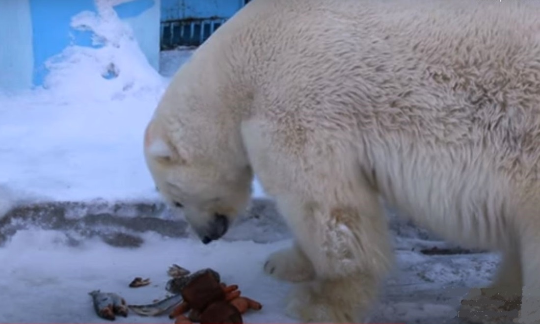 Жительница Новосибирска Анна Новикова сняла на видео завтрак белого медведя Кая в зоопарке имени Ростислава Шило. В его меню вошли рыба, овощи и хлеб.