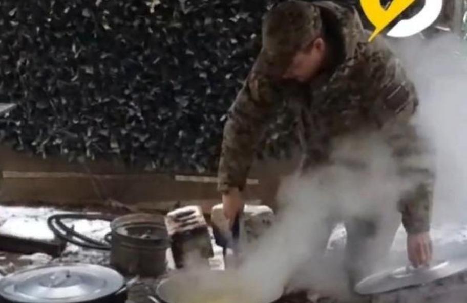 Для военных, как правило, готовят куриный суп с вермишелью, пельмени, вареники, котлеты, пюре. Часто к обеду подают сало, горчицу, нарезки из сыра и колбасы. Готовят только в перчатках, поверхности регулярно протирают хлоркой.