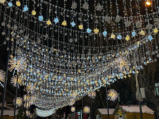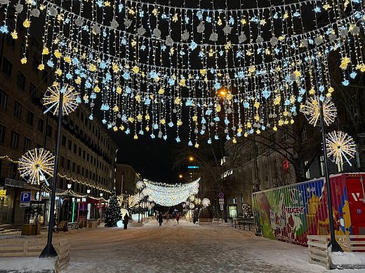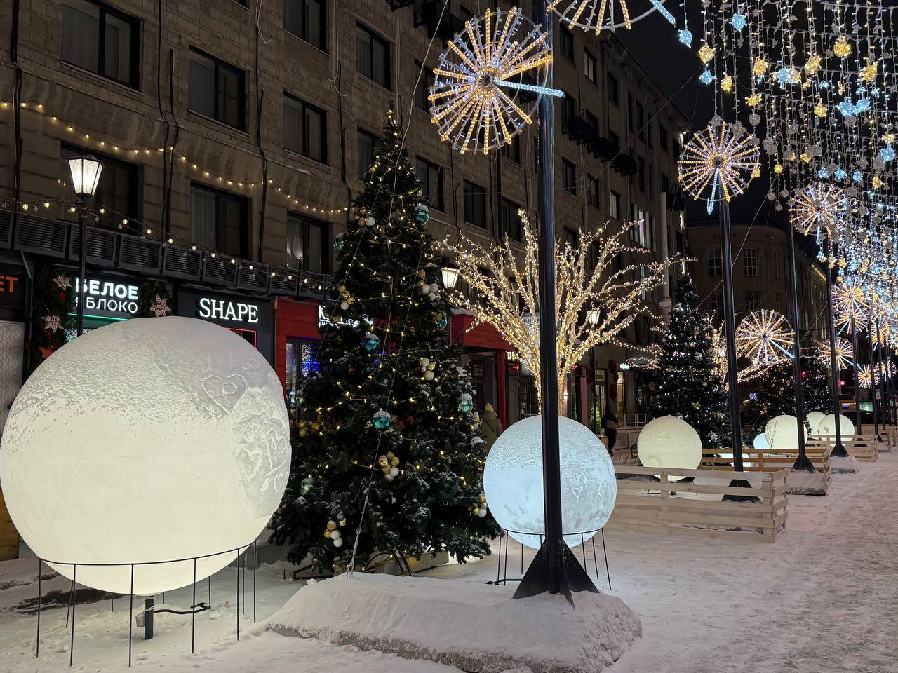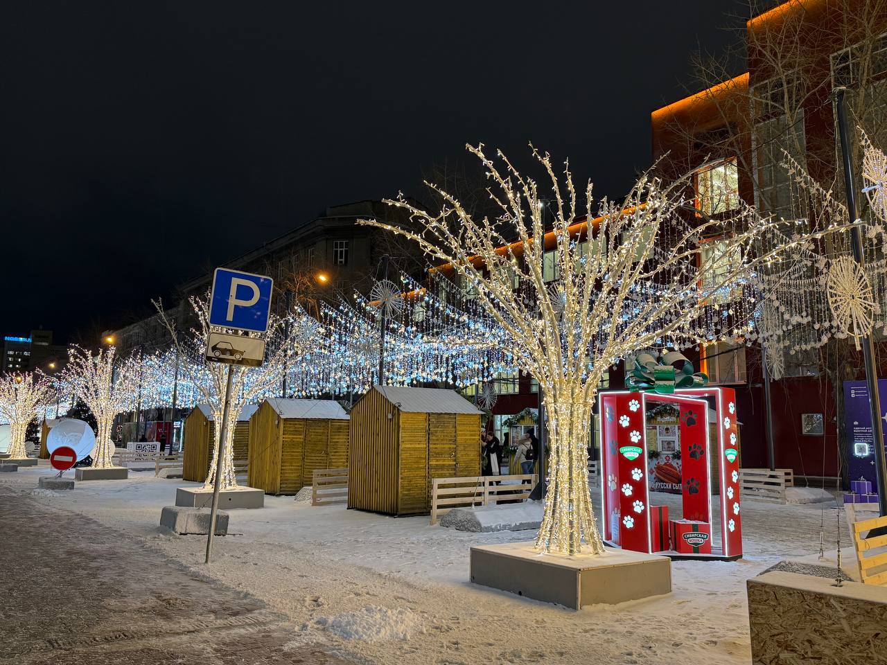 На пешеходной части установили светящуюся инсталляцию, верх которой украшен красными и золотыми шарами. Там также появились: подвесной потолок из гирлянд, искусственные ели и деревянные домики с горячими напитками и едой.