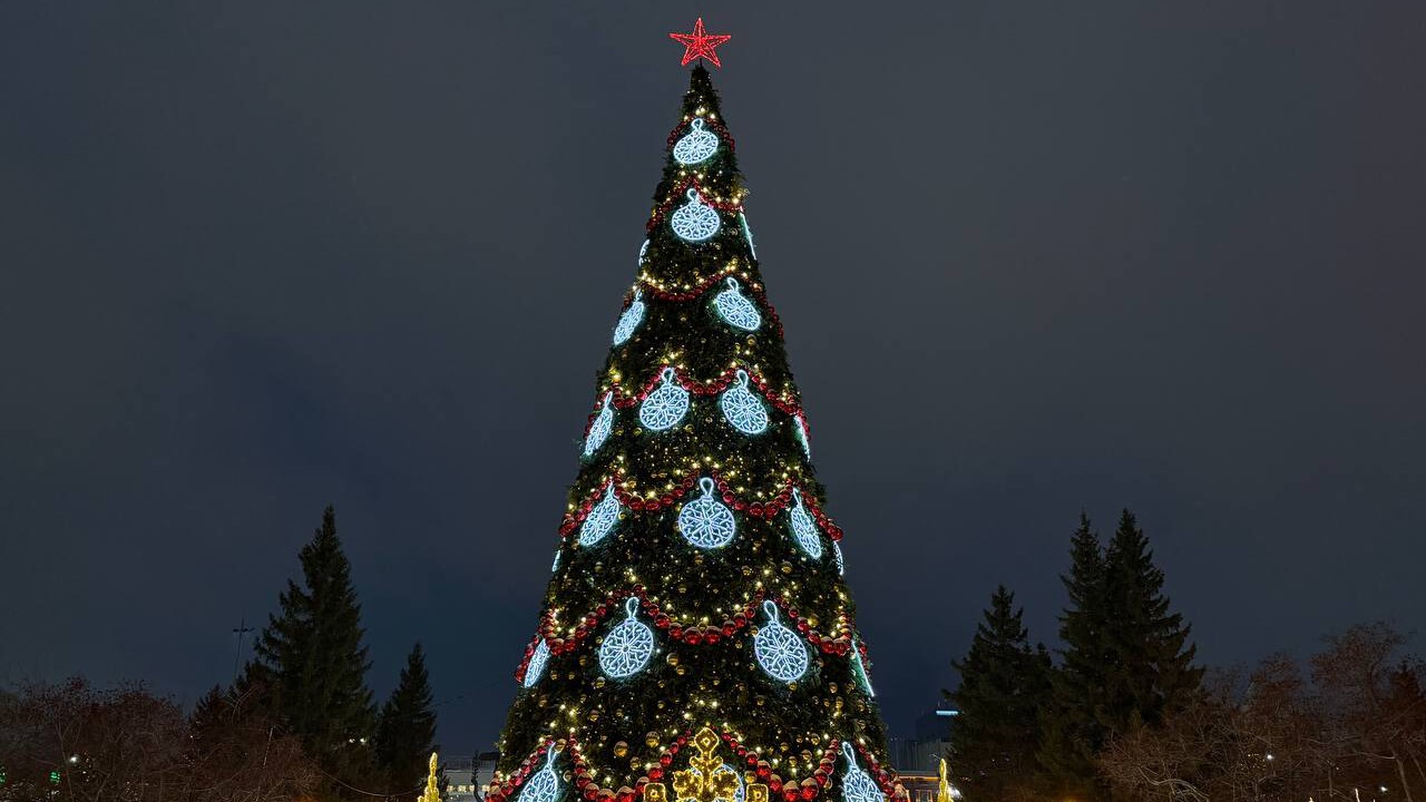 В Театральном сквере у НОВАТа поставили светодиодные арки «Волшебный лес», гигантские шары и инсталляции. На большой ёлке в русском стиле красуются бело-синие шары и красные бусы, а на верхушке огромная звезда.