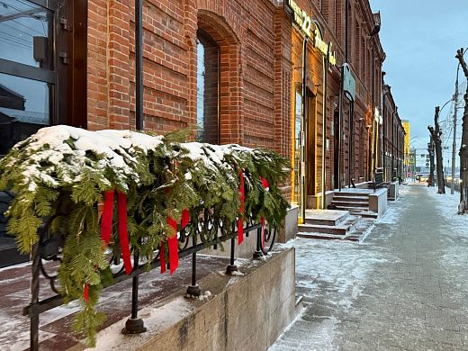 Сквер у Краеведческого музея тоже не оставили без внимания. Здесь деревья загорелись яркими огнями, их украсили огромными снежинками. Легендарные дворики тоже увешаны гирляндами.