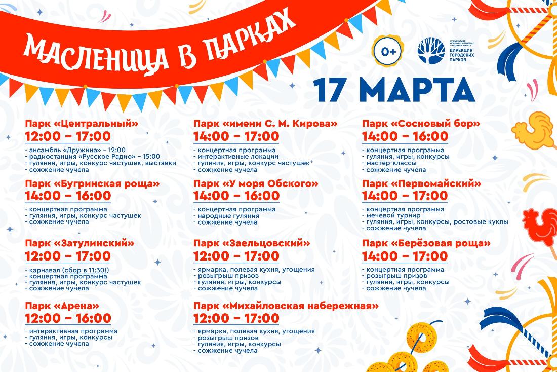Народные гуляния пройдут почти во всех парках мегаполиса. В Центральном парке, на Михайловской набережной, в Заельцовском парке, Затулинском парке и парке «Арена» празднование пройдёт 17 марта с 12:00 до 17:00. В «Березовой роще», парке Кирова, Первомайском, Сосновом бору, «У моря Обского», в «Бугринской роще» мероприятия пройдут с 14:00 до 16:00.