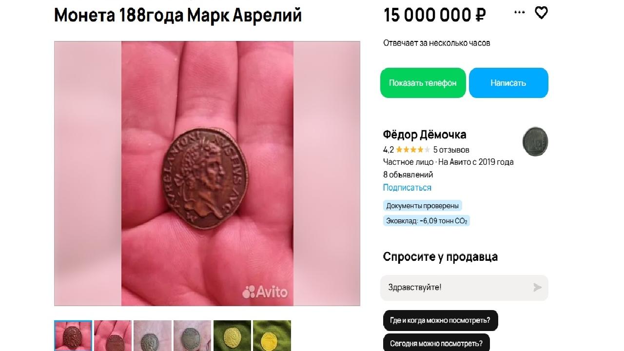 Монету, выставленную на продажу, оценили в 15 млн рублей. Она якобы золотая и может занять своё место в коллекции фанатов нумизматики. Вероятно, это редкий золотой ауреус, представляющий высокую историческую и коллекционную ценность. Недолгое время выпускали половину ауреуса – золотой квинарий. Ауреус равнялся 25 серебряным динариям, а динарий включал 4 бронзовых сестерция и 16 медных ассов.