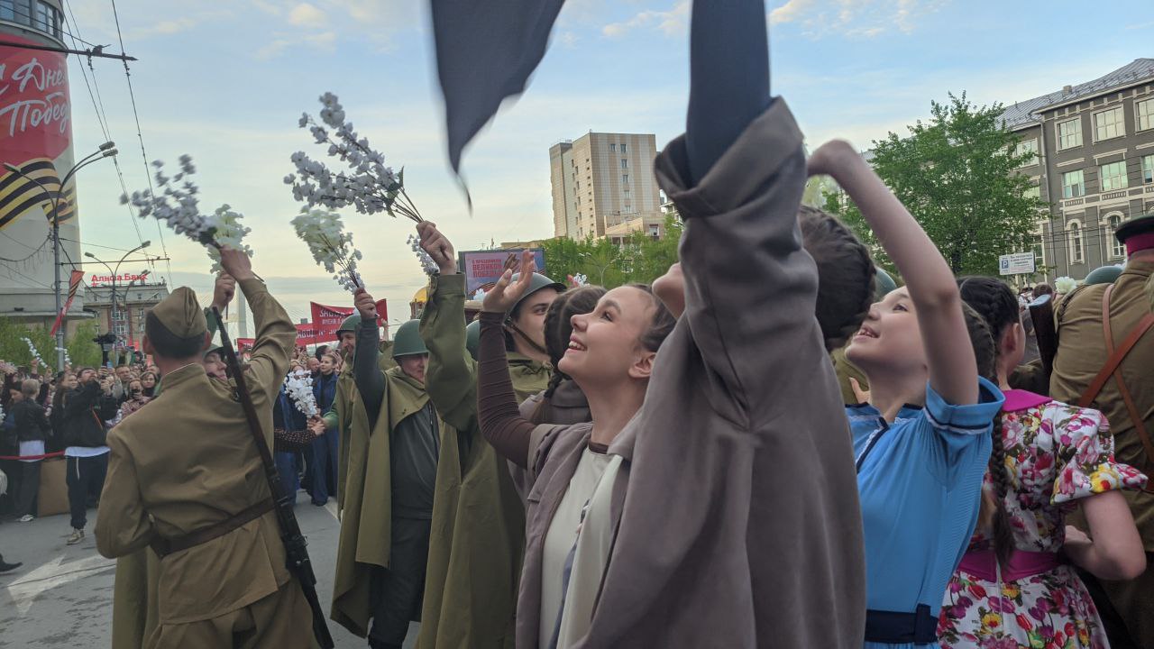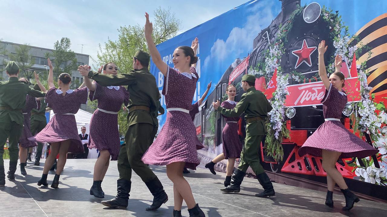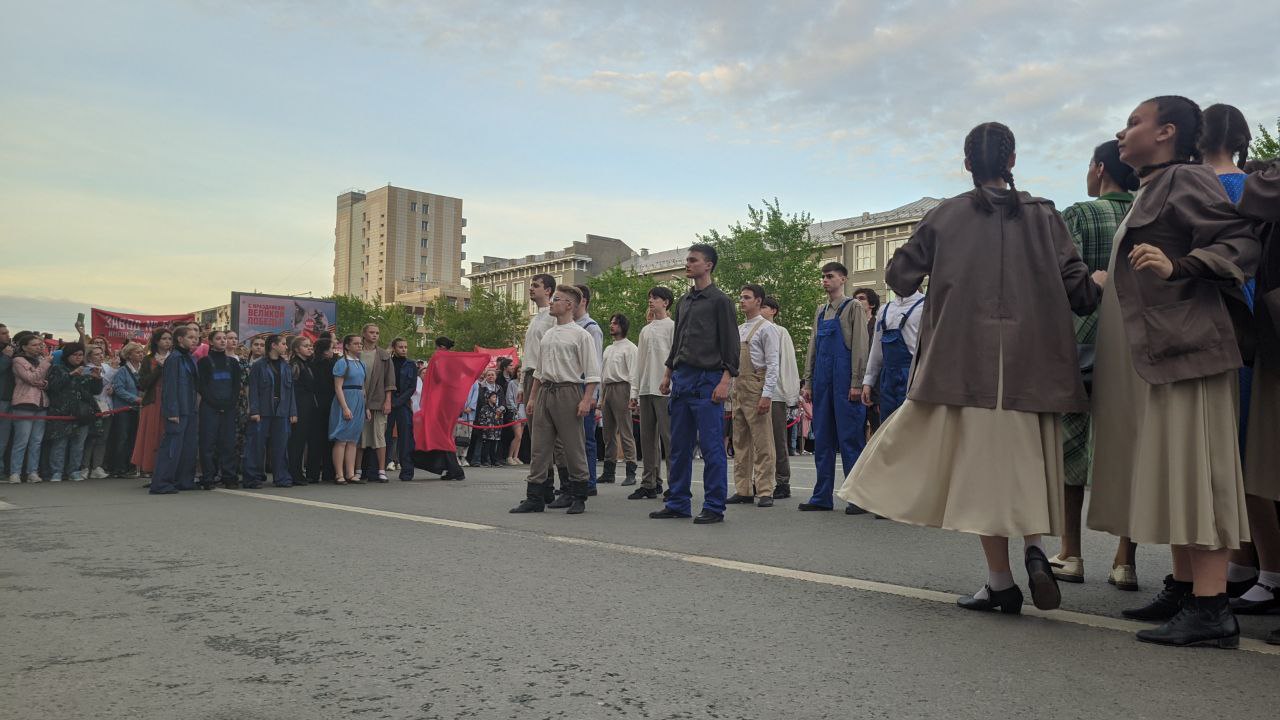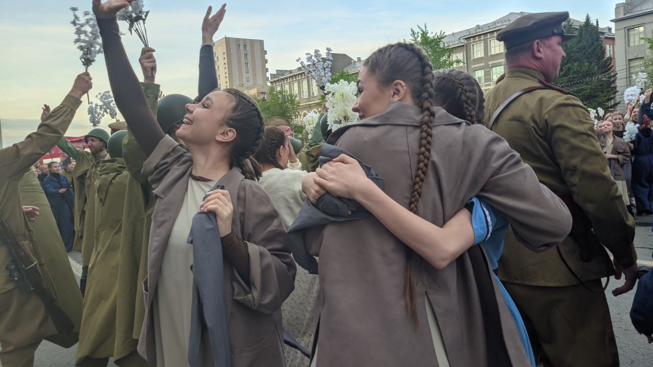 Далее артисты озвучили рассказы новосибирцев, которые стали свидетелями победы на фронте и в тылу. Творческие коллективы в свою очередь показали, как работники эвакуированных заводов встретили весть о Победе. Они обнимались и пели, как в 1945 году.