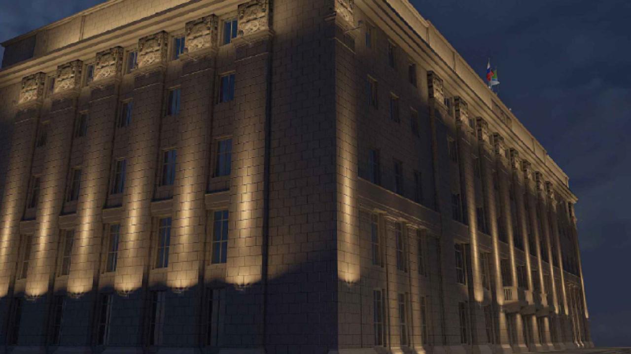 В проектной документации сказано, что светотехническое оборудование установят на фасадах здания. Подсветка будет меняться в зависимости от даты: предусмотрены варианты для будней и праздников.