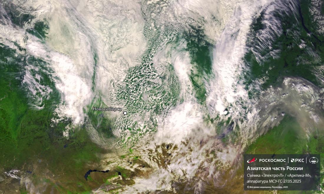 За несколько дней до лета Новосибирская область оказалась под влиянием снежного циклона. Роскосмос опубликовал спутниковый снимок, на котором видно, как атмосферный вихрь принёс в регион несезонные осадки и похолодание.