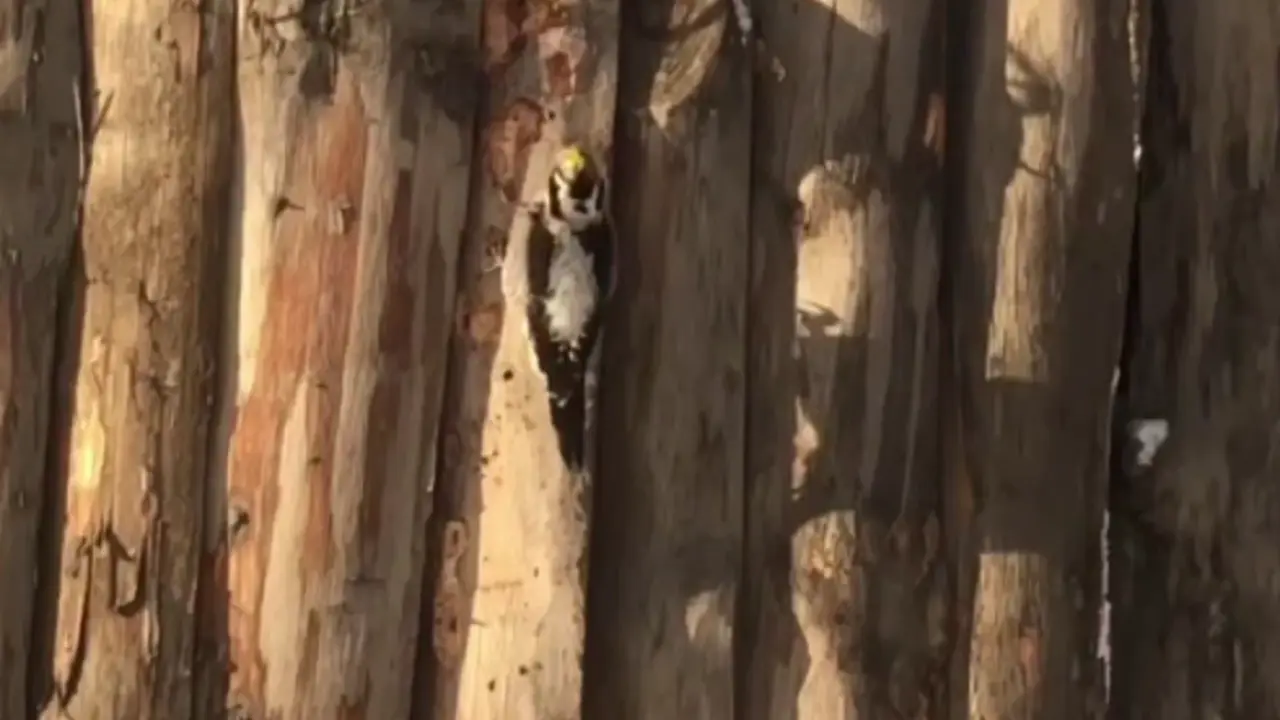 Трёхпалый дятел привлёк внимание, когда начал громко долбить деревянное ограждение в «Динопарке». На шум прибежали сотрудница зоопарка и волонтёр Фонда имени Р. А. Шило Анастасия Вишневецкая. Ей удалось заснять птицу на телефон.