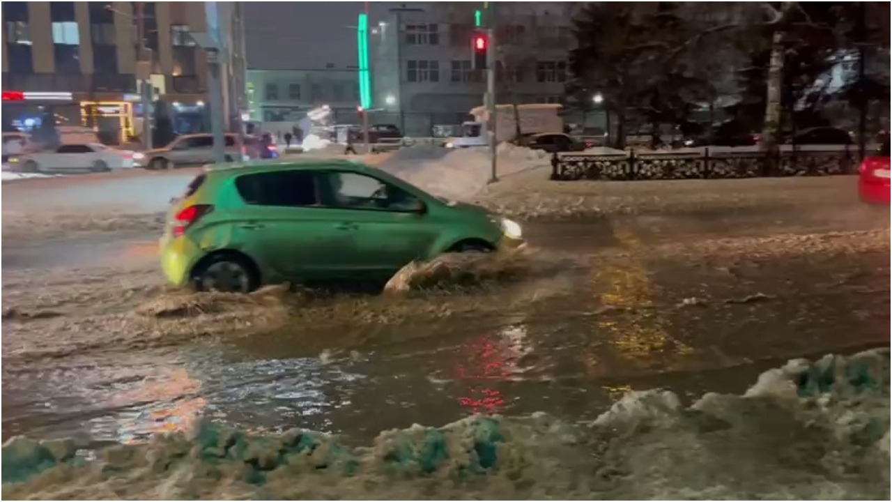 После нескольких дней снегопада температура воздуха вернулась к плюсовым значениям, и город утонул в талых водах. И это несмотря на то, что дорожники круглосуточно чистят улицы.