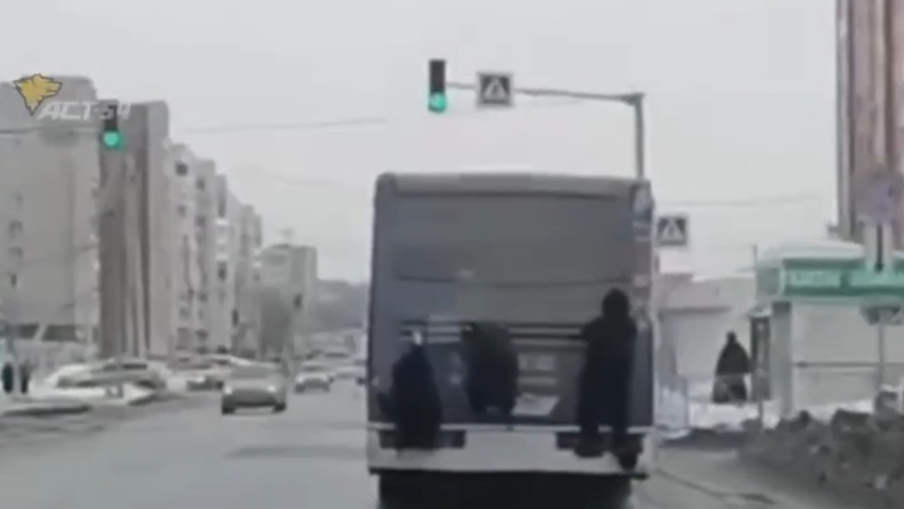 Они прицеплялись к задней части автобуса на улицах Пархоменко и Троллейной. На замечания прохожих экстремалы не реагировали.