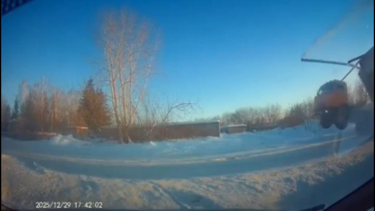 Водитель грузовика забыл опустить кузов после выгрузки снега. От удара газопровод разлетелся на части, а грузовик оторвался от земли.