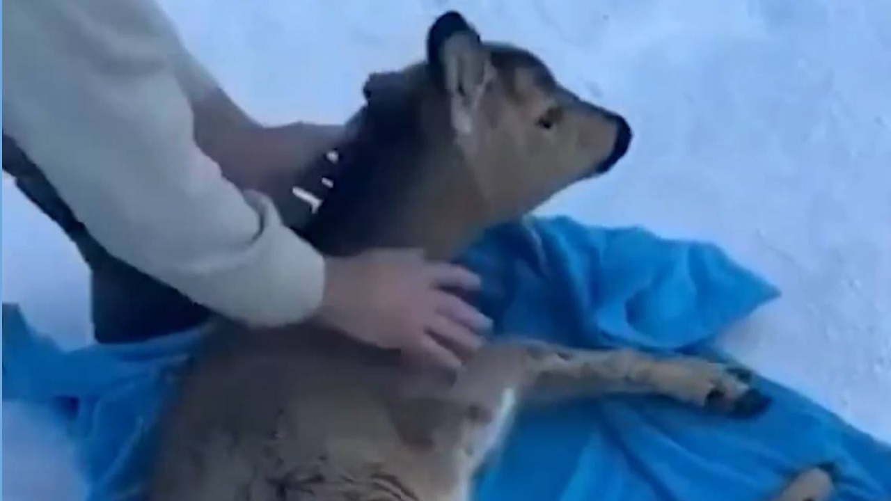 Отец и сын заметили косулю и освободили её из ледяного плена. Они принесли животное домой, чтобы отогреть и убедиться, что с ним всё в порядке. Косуля, похоже, была рада помощи и совсем не сопротивлялась.