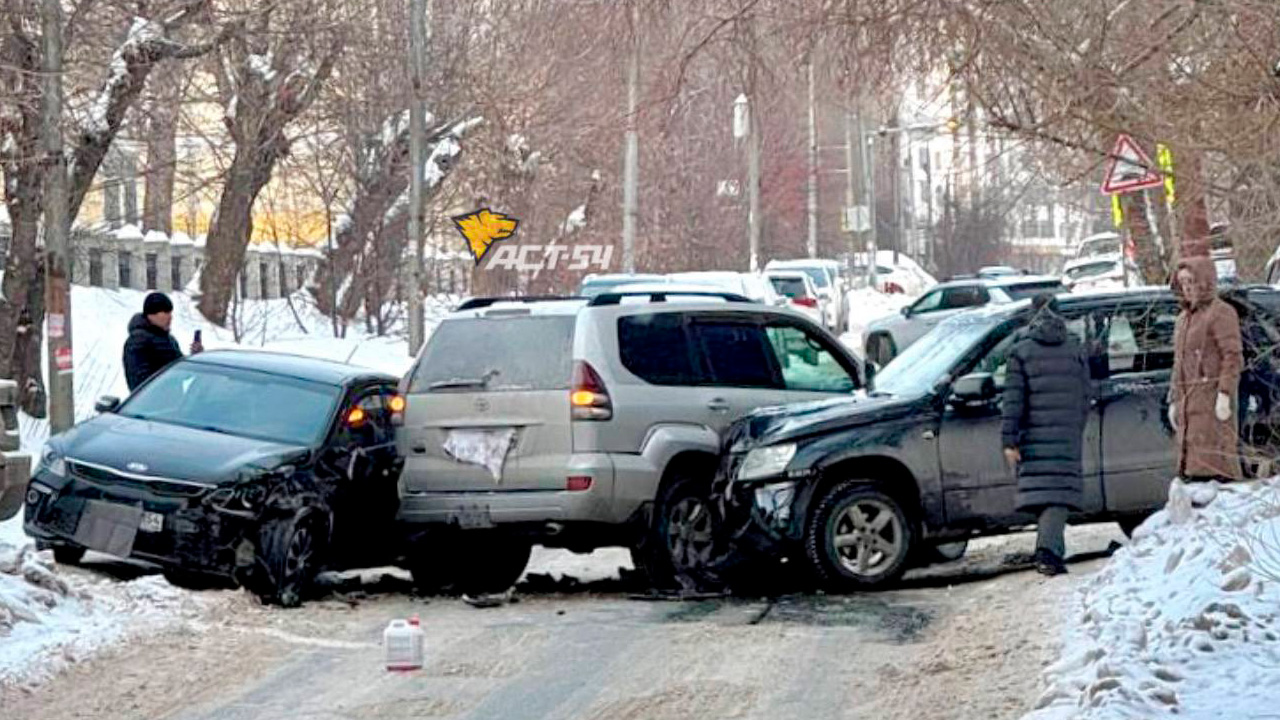 В Новосибирске произошло серьёзное ДТП с участием трёх автомобилей: внедорожников Suzuki Grand Vitara и Land Cruiser Prado, а также седана Kia Rio. Движение на дороге полностью перекрыто.