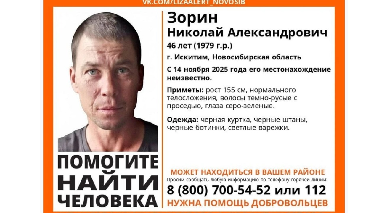 46-летний житель Искитима исчез 14 ноября после визита к бывшей жене. Семья и волонтёры пытаются найти его, но пока никаких зацепок нет.