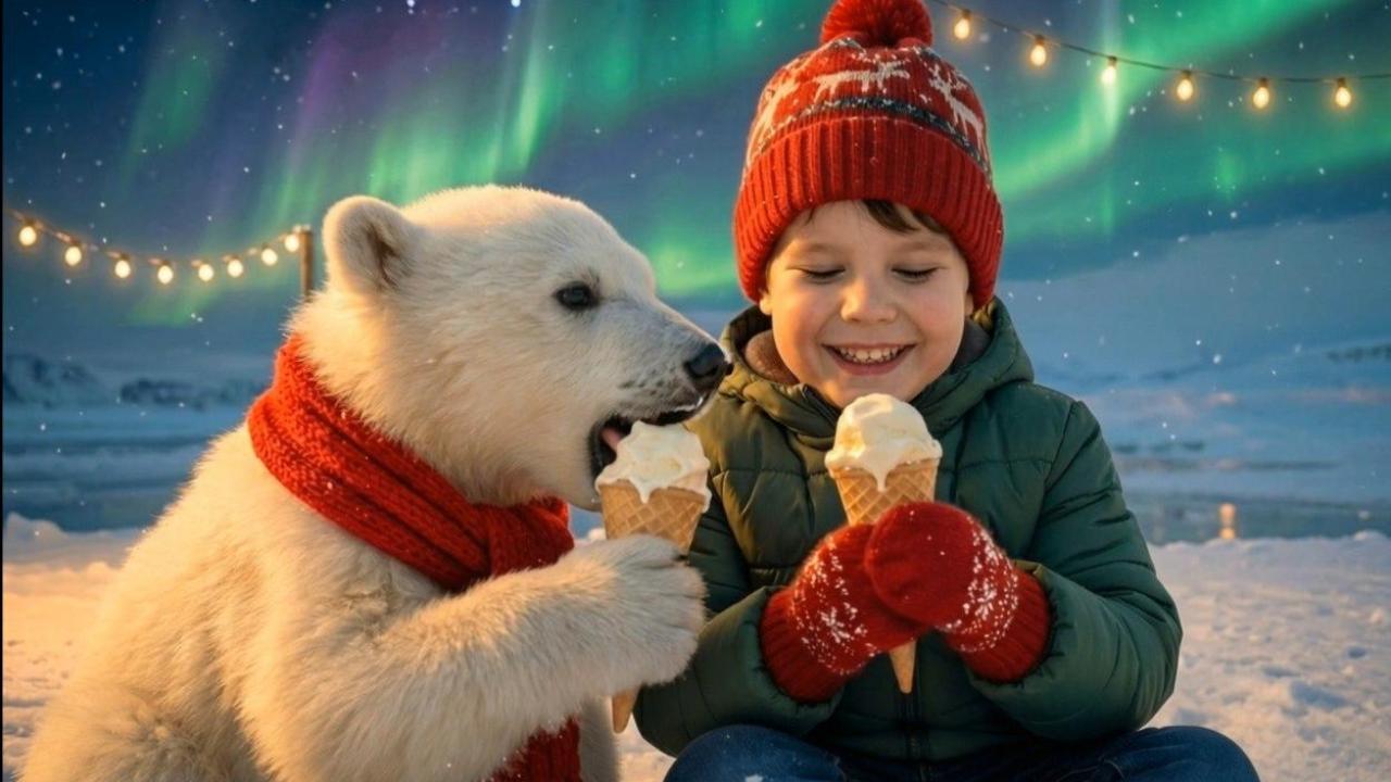 В создании сказочной атмосферы помогал искусственный интеллект. Очень многие эпизоды прорисованы так, что и не отличишь от настоящей съёмки. Запечатлеть мальчика, который ест мороженое вместе с полярным медведем, просто невозможно. А нейросеть – смогла.