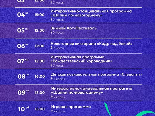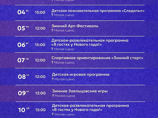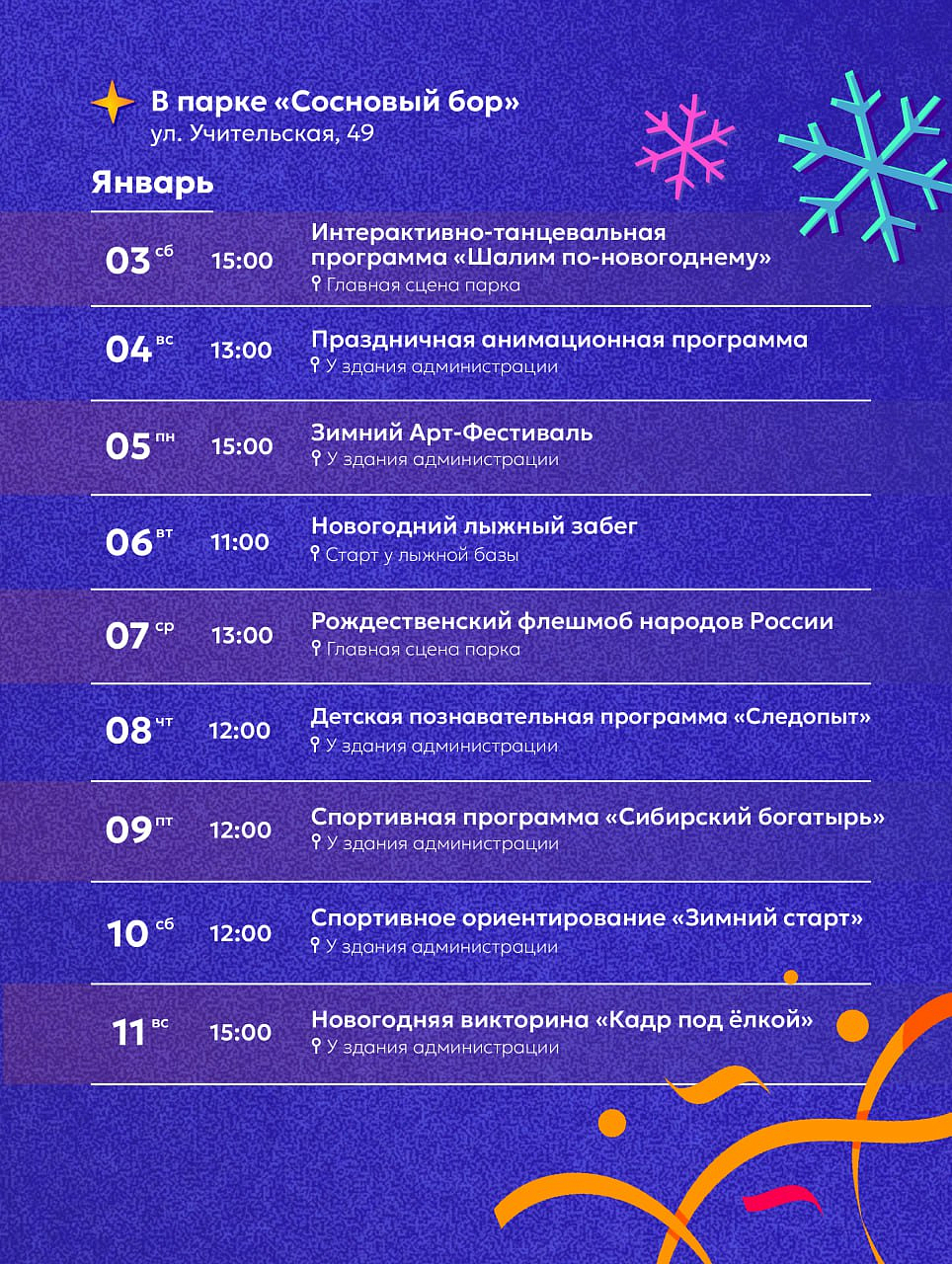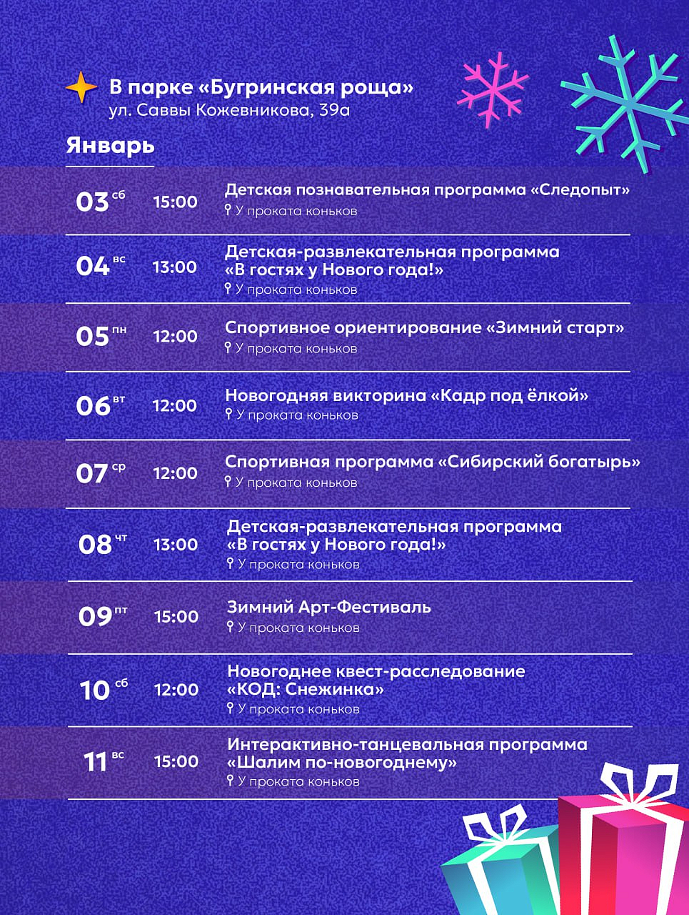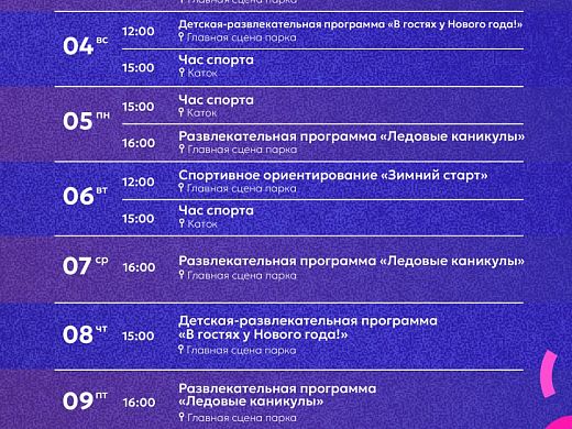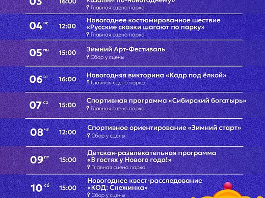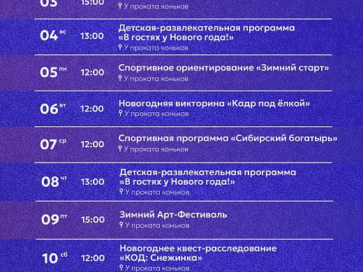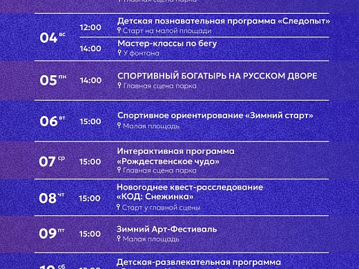 Праздничные новогодние и рождественские мероприятия будут проходить с 3 по 11 января. Горожан ждут творческие фестивали, спортивные турниры, зажигательные танцы и познавательные квесты.