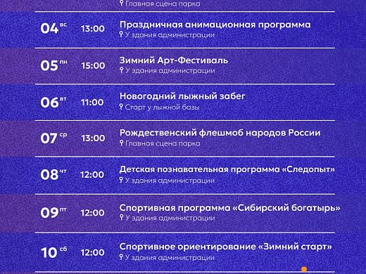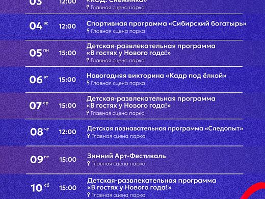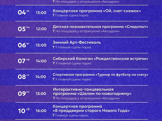 Дети и взрослые посетители парков смогут стать следопытами, превратиться в сибирских богатырей, раскрыть новогодние коды и рисовать на зимнем арт-фестивале. Также в парках проведут костюмированные шествия, хоккей на валенках и многие другие мероприятия.