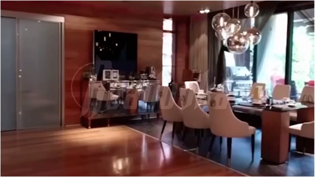 Особняк расположен в коттеджном посёлке «Успенские поляны» на участке в 20 соток. На территории есть сад и дом для прислуги. Внутри коттеджа — 10 спален, мансарда, спа-зона с бассейном и детский этаж.