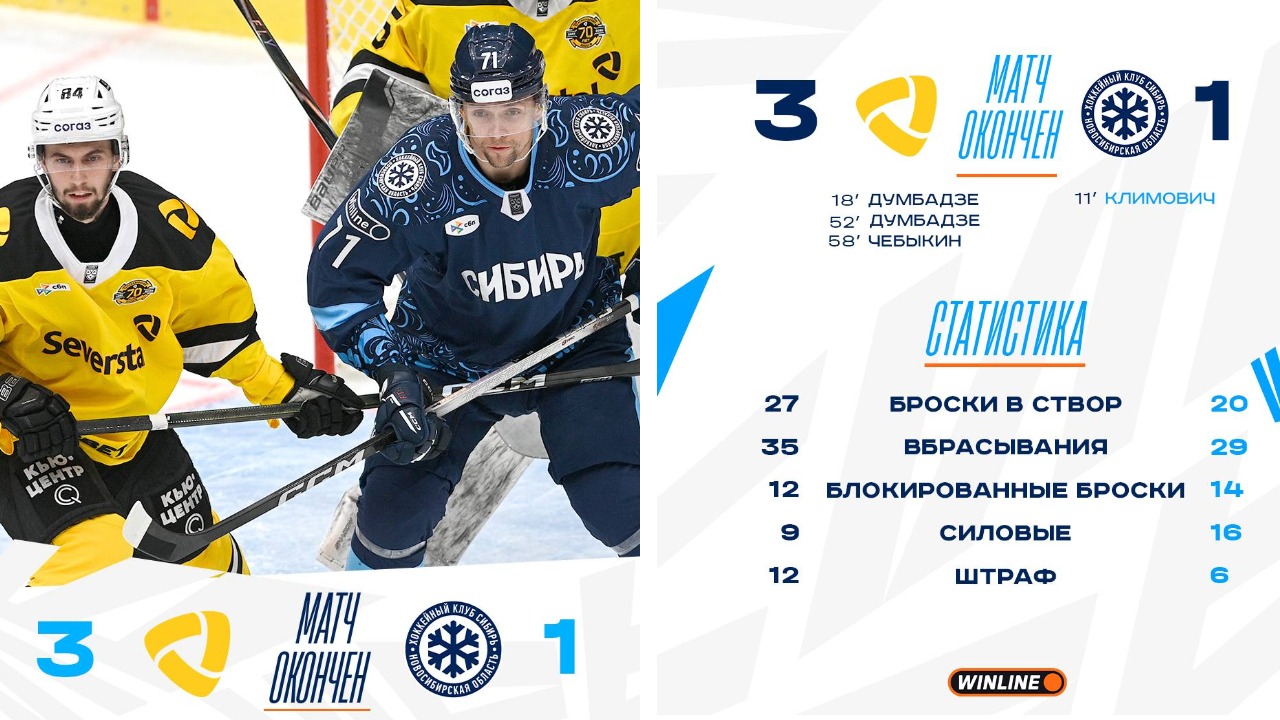 «Северсталь» обыграла новосибирскую «Сибирь» со счётом 3:1. Об этом сообщили в пресс-службе новосибирского хоккейного клуба.