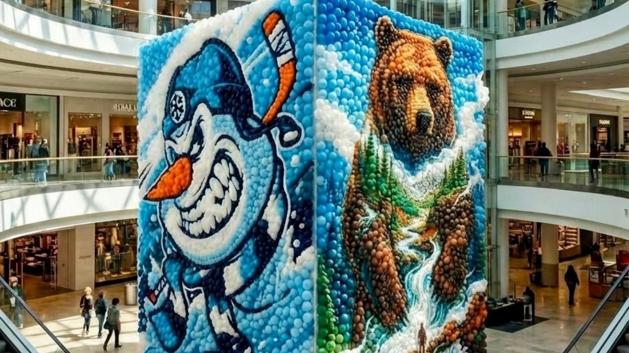 8 апреля в Новосибирске в торговом центре «СибМолл» представили большое панно из воздушных шаров. Композиция изображает медведя и талисман хоккейного клуба «Сибирь» – снеговика.